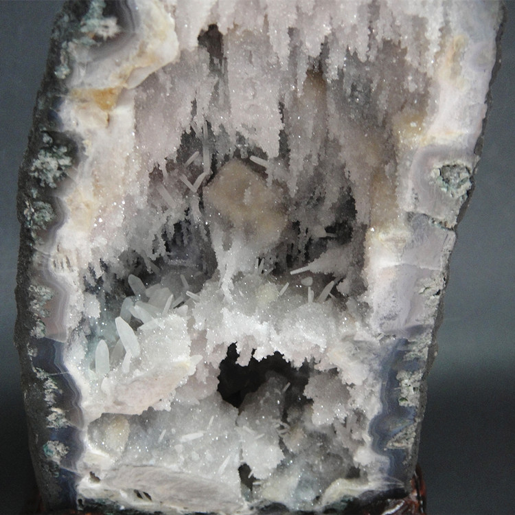 当珍贵水胆玛瑙因辨别不准切开后,水份蒸发,外层为玛瑙,里面常有许多雪白、晶莹、剔透、细腻的大片水晶结晶,犹如神仙居住的洞天福地,也是能量聚集点—龙穴。通常切开两半摆放,打开