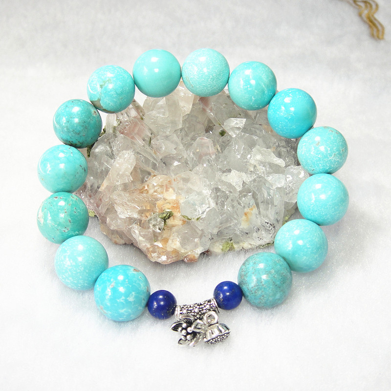 规格:绿松石圆珠直径约12mm 14颗;青金圆珠8MM 2颗;泰银配件1颗。